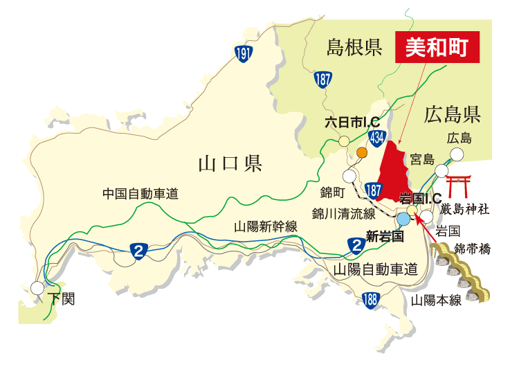 ※2006年(平成18年)3月20日 近隣の由宇町・玖珂町・本郷村・周東町・錦町・美川町とともに、岩国市に合併しました。 以降、美和町は「みわちょう」から「みわまち」と呼び名を変えています。