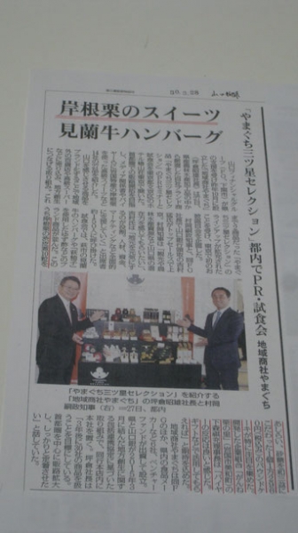 ブログ 山口新聞 27日のホテル椿山荘での地域商社やまぐちの「やまぐち三ツ星セレクション」のPRコーナー&試食会のことが掲載されました。 「岸根栗のスイーツ」として当組合の「岩国がんね栗 煌」のことが取り上げられています。 こうして「がんね栗」のことが皆様に認知されることが大事なことです。 2018/03/30 ≪ ホテル椿山荘東京 | 名古屋で ≫ /blog/blog_comments/captcha/15219 /blog/blog_comments/get_token