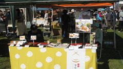 初めての出店です。芝生の所で、風が強く、日差しもあたり、商品は机の下の日陰に。